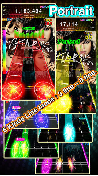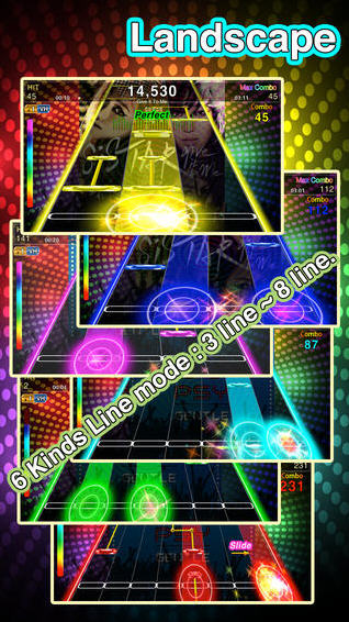 选择歌曲之后可以看到超级丰富的演奏设置,首先是 Portrait 和 Landscape 两种模式,其实就是竖屏和横屏显示模式,然后是从 3 线到 8 线的下落模式,一般来说竖屏比较适合 4 线以内,而如果你想尝试"全指出动"的 8 线模式,大可选择空间更宽裕的横屏模式。游戏不会做任何限定,玩家可以对任何一首歌调整自己想要的模式。